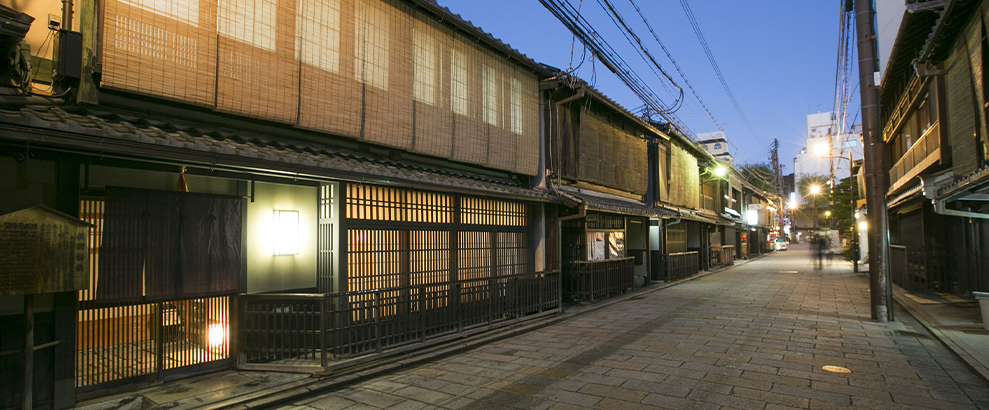 It is a fine artistic wooden structure and facing the historical preserved district in “Gion” area where many of them were high-ranked teahouses in former days.